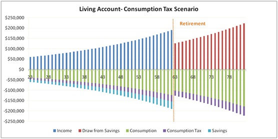 Investment returns are no longer taxed. Under the consumption tax scenario, the savings account retains a substantial balance of approximately $2.3 million by age 82, compared to zero in the income tax scenario. This money provides the retiree with additional flexibility.